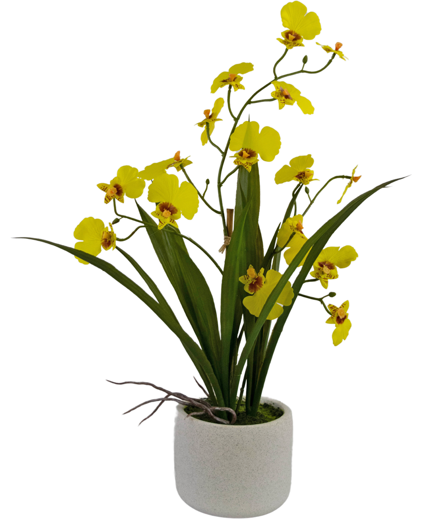Verleihen Sie Ihrem Raum mit der Künstlichen Oncidium Real Touch einen Hauch von Eleganz und Lebensfreude. Diese beeindruckende Kunstblume misst 48 cm und besticht durch ihr strahlendes gelbes Design, das die Frische der Natur in Ihr Zuhause bringt.