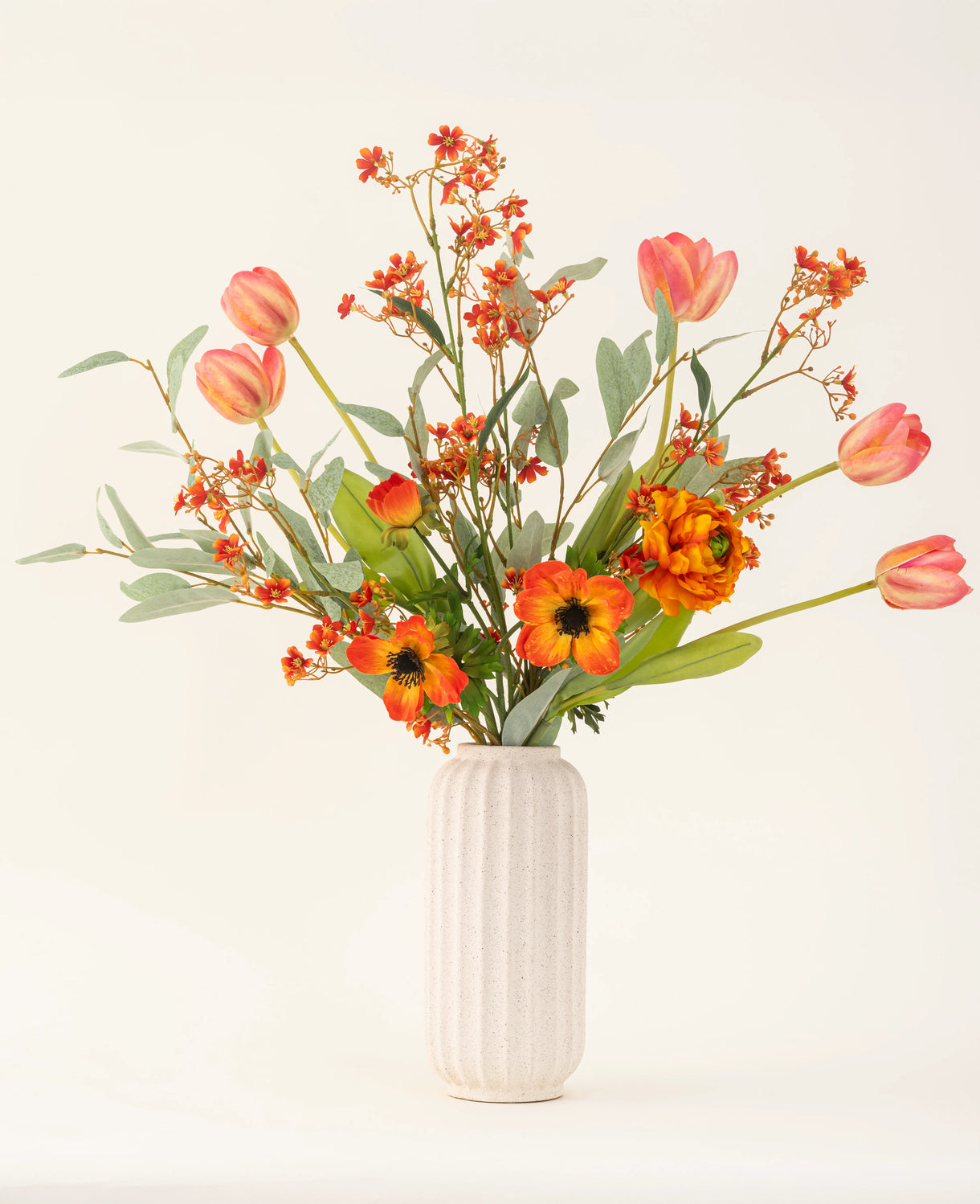🌸 Seiden-Kunstblumenstrauß Orange Glory Bringen Sie Wärme, Energie und einen Hauch von Luxus in Ihr Zuhause mit dem Kunstblumenstrauß Orange Glory aus Seide. Dieser handgebundene Strauß besteht aus 11 hochwertigen Stielen, die sorgfältig zu einer kräftigen Mischung aus orangefarbenen, gelben und frischen grünen Farbtönen zusammengestellt wurden. Das Ergebnis ist ein lebendiger, moderner Strauß, der jedem Raum sofort Atmosphäre und Charakter verleiht. Die orangefarbene französische Tulpe, die Anemone und der Seidelbast bilden zusammen das strahlende Herz des Straußes. Der dunkelgelbe Ranunkelstrauß verleiht dem Strauß Tiefe und einen warmen Glanz, während der grüne Eukalyptus für eine natürliche, luftige Textur sorgt, die das...