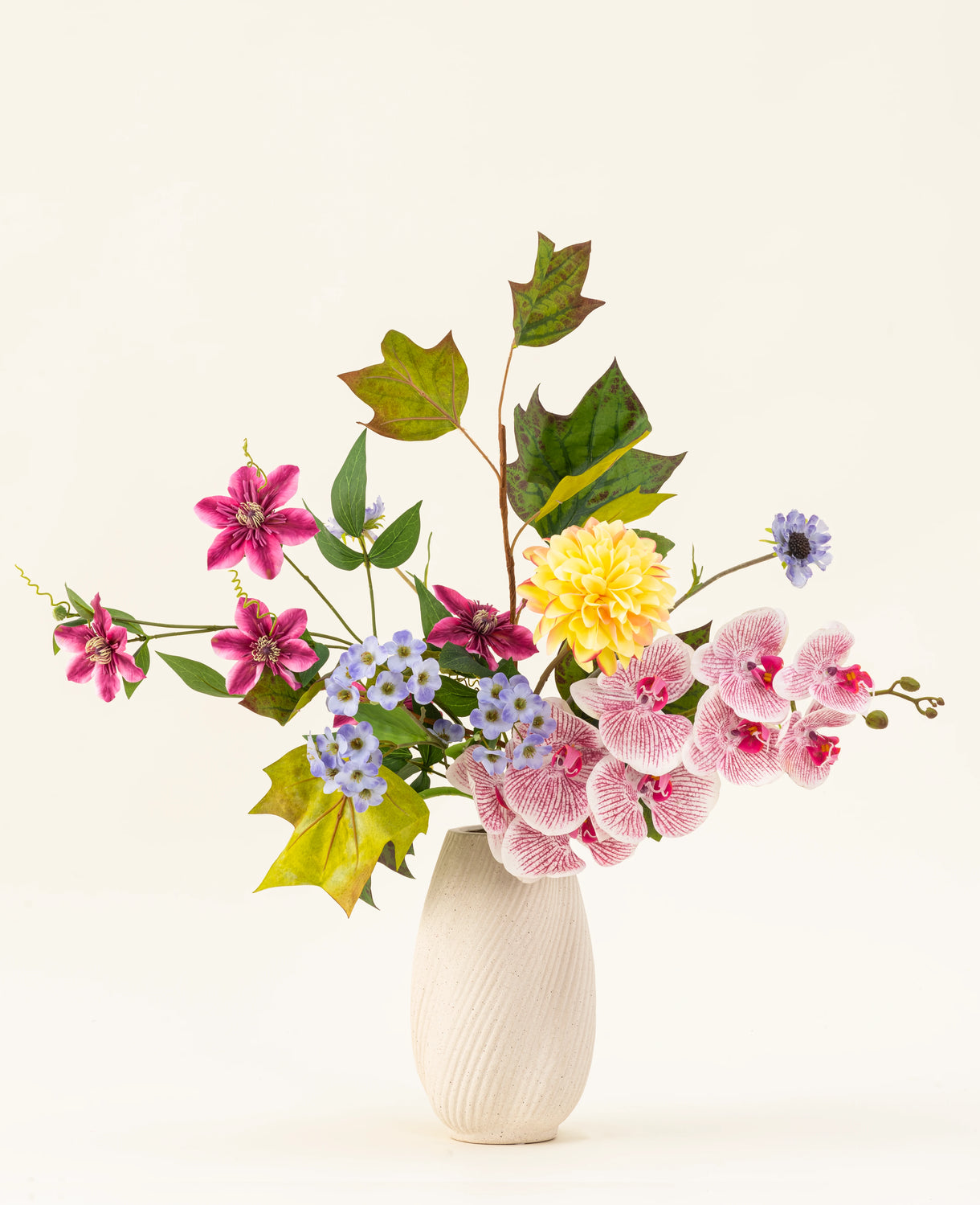Das tief gefärbte Clematis -Doppel und die satte Orchidee echte Berührung in Fuchsia und Lila bieten einen auffälligen Farbkontrast, während die Dahlia Real Touch in Champagner ein weiches, leuchtendes Gegenstück ist. Das großzügige Tulpenblatt und die Farnzweige bringen die natürliche Tiefe und Struktur in den Blumenstrauß und stärken den gartenähnlichen Charakter.