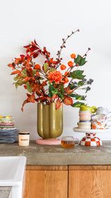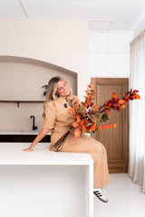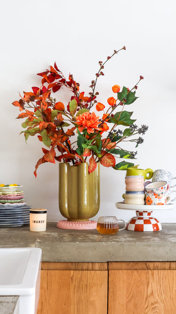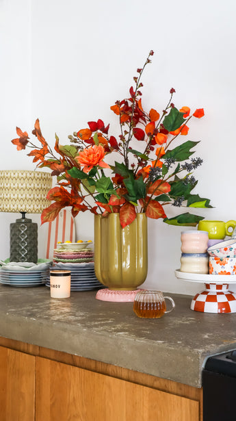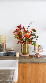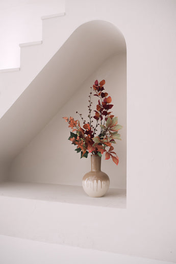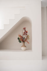 Chestnut Charm erweckt die reichen Farben und Texturen des Herbstes in einem stilvollen Seidenstrauß zum Leben. Mit tiefen roten und orangefarbenen Tönen, robusten Blättern und verspielten Beerenstrukturen ruft dieses Arrangement das Gefühl eines Waldspaziergangs in der Oktobersonne hervor. Ein kraftvolles, aber raffiniertes Stück, das jedem Raum Wärme und Charakter verleiht, ohne zu dominieren.