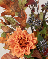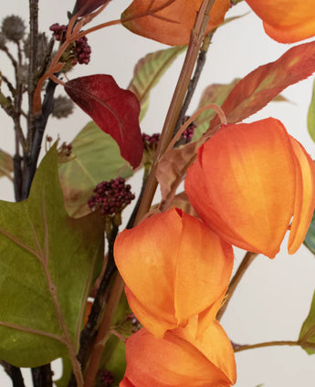 Der elegante Kastanienzweig und der rote Buchen bilden eine geschichtete Basis voller Tiefe, während die Real Touch in Orange in Physalis Lampion und Dahlia lebendige Farbakzente liefern. Der Callicarpa in lila und japanischer Beere in Stahlblau bringt eine...