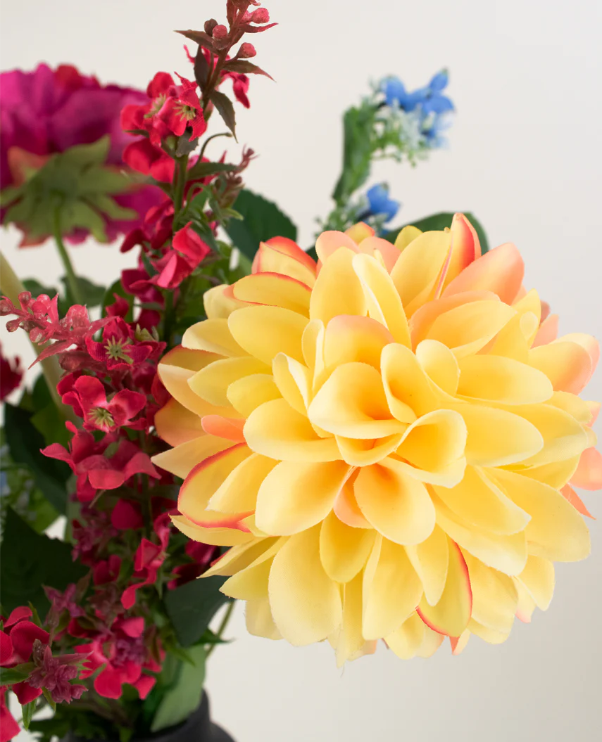 Entdecken Sie die zeitlose Schönheit des Konfetti Bloom Bouquet, eine exklusive Komposition hochwertiger Seitenblumen, die Ihr Interieur aufhellen. Dieses Seidenstrauß kombiniert Eleganz und Bequemlichkeit und besteht aus einer funkelnden Mischung aus Dahlia Real Touch, Catnip, Ranunculus, Hibiskus, französischem Sichtwert Tulp, Pfingstrosen und wilder Hortensien.
