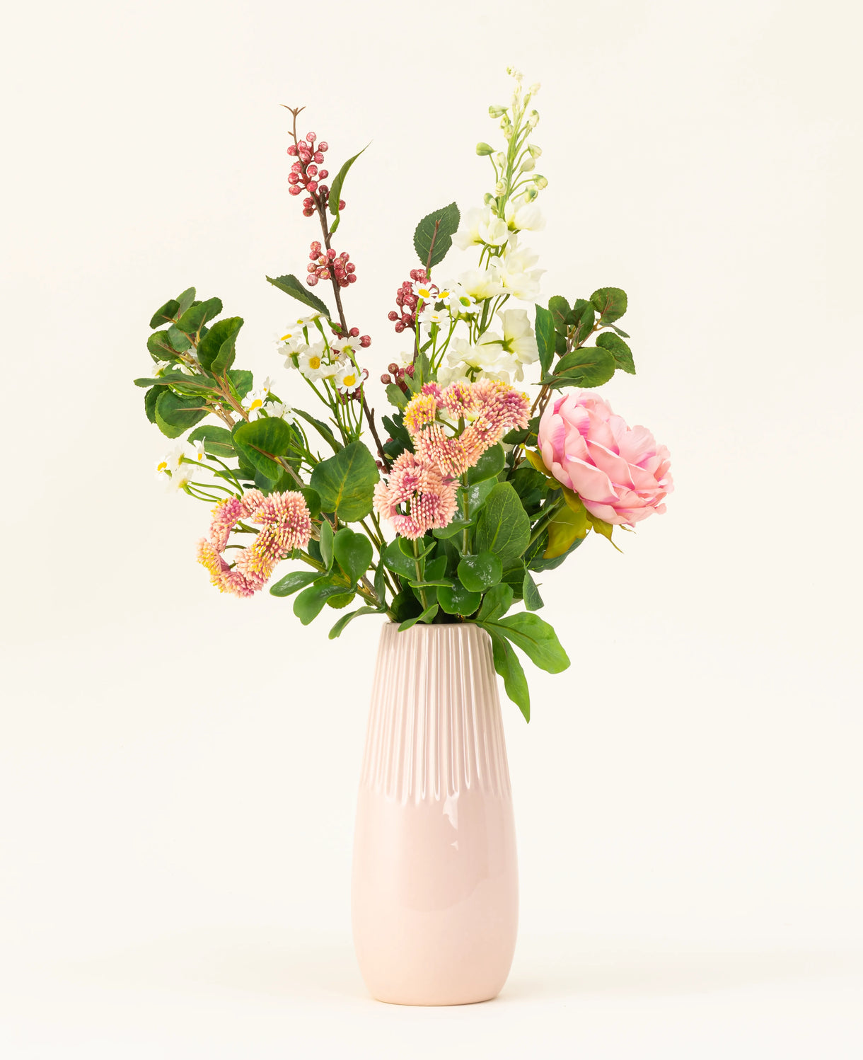 Daisy Charm ist ein Seidenstrauß, der Frische und natürliche Eleganz zusammenbringt. Mit einer harmonischen Mischung aus Rosa, Weiß und Grün strahlt diese Anordnung Weichheit und Lebendigkeit aus. Perfekt für diejenigen, die einen frischen, romantischen Look und eine zeitlose Dekoration mögen, die Wärme und Verfeinerung bringt.