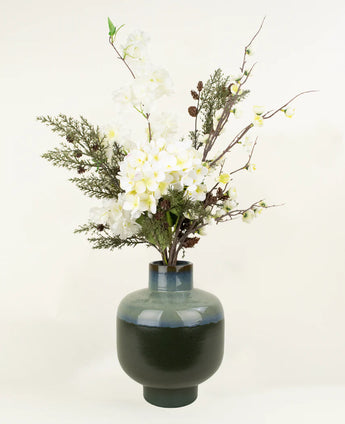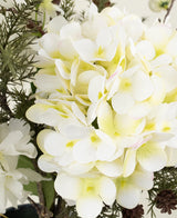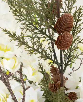 Die Kiefernnadeln in unterschiedlichen Längen bilden eine spielerische und natürliche Basis, während die japanische und seidenkirschblüte die helle Eleganz und die zerbrechliche Pracht des Frühlings erwischt. Die echte Touch Hortensia in Crème verleiht eine warme, vollständige Note, die die ganze reichhaltiger und lebhaft macht.
