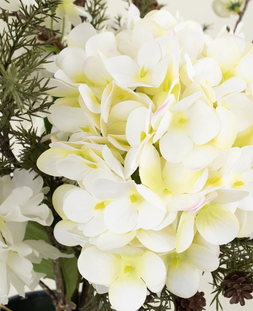 Rustikal, natürlich und weich - das Erdlicht der Seidenstrauß bringt die ruhige Schönheit einer friedlichen Waldlandschaft. Mit einer frischen Mischung aus grünen Kiefernzweigen, zarten weißen Kirschblüten und weicher Creme -Hortensien schafft dieser Bouquet eine ruhige und harmonische Atmosphäre, die Entspannung einlädt.