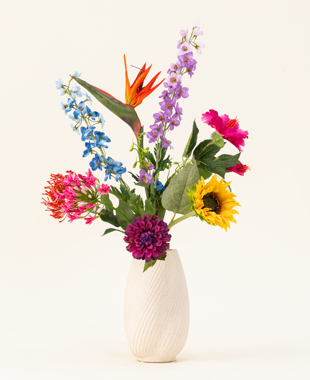 Gehen Sie in eine harmonische Blumenwelt mit der Seidenstrauß Garden Melody - einer reichhaltigen und laminierten Anordnung voller Farbe, Kontrast und Charakter. Dieser Blumenstrauß kombiniert den weichen Charme von Sommerblumen mit exotischen Akzenten für eine kraftvolle, elegante Aussage in jedem Innenraum.