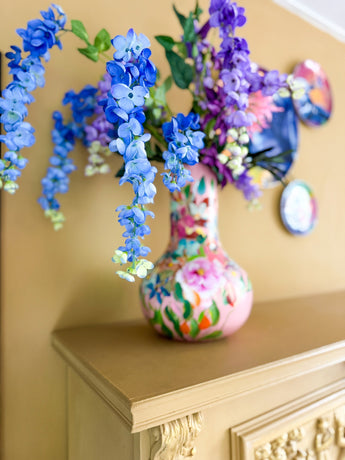 Die üppige Wisteria und Bewerragen bieten eine anmutig fallende Basis, während die Clematis groß in Lila und das elegante Nerin in rosa Höhe und Farbkontrast bieten. Der Green Bay -Zweig fügt natürliche Frische hinzu und bringt sie in das Gleichgewicht.