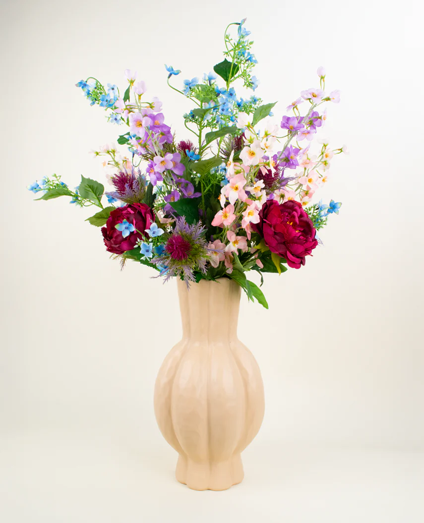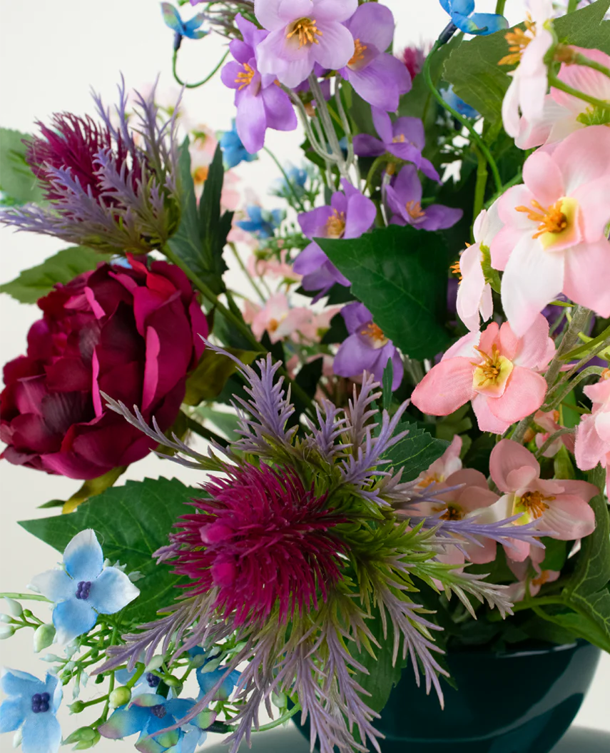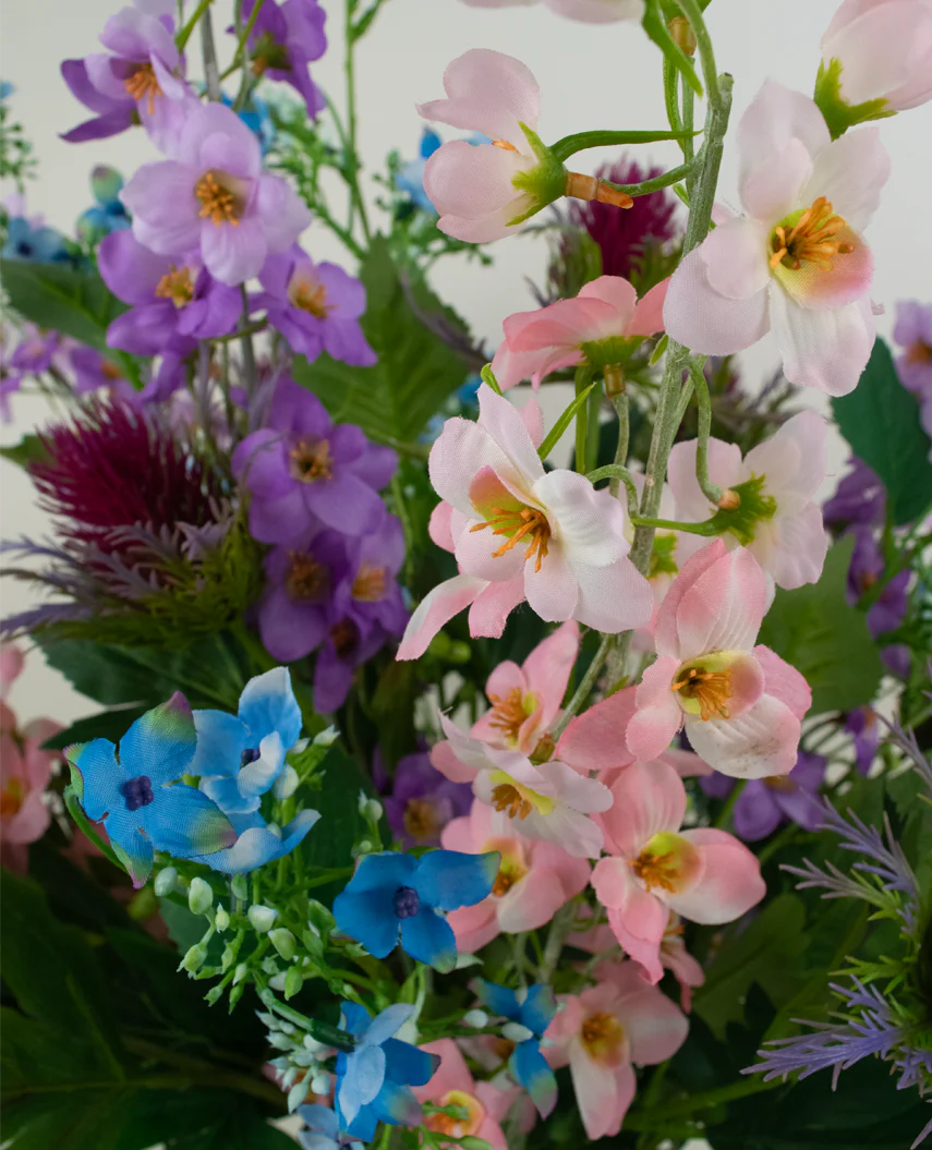 Dieser hochwertige Kunstblumenstrauß vereint eine sorgfältig komponierte Auswahl an Blumen: die charakterstarke Distel, das raffinierte Delphinium, die bezaubernde Wilde Hortensie und die üppige Pfingstrose. Ergänzt durch sanfte Grüntöne entsteht ein kunstvolles Bouquet, das seine Schönheit über Jahre hinweg bewahrt – ohne Pflegeaufwand.