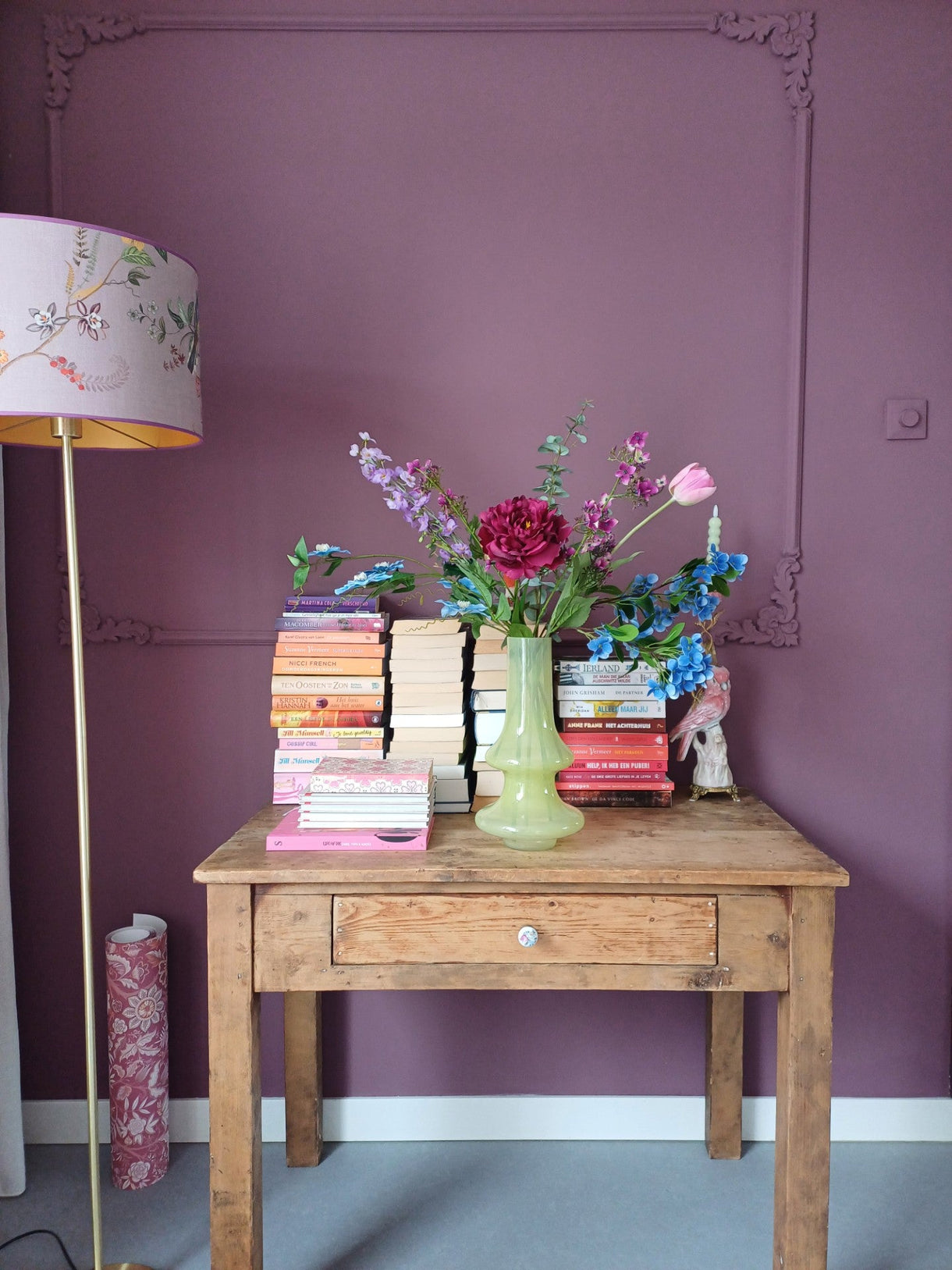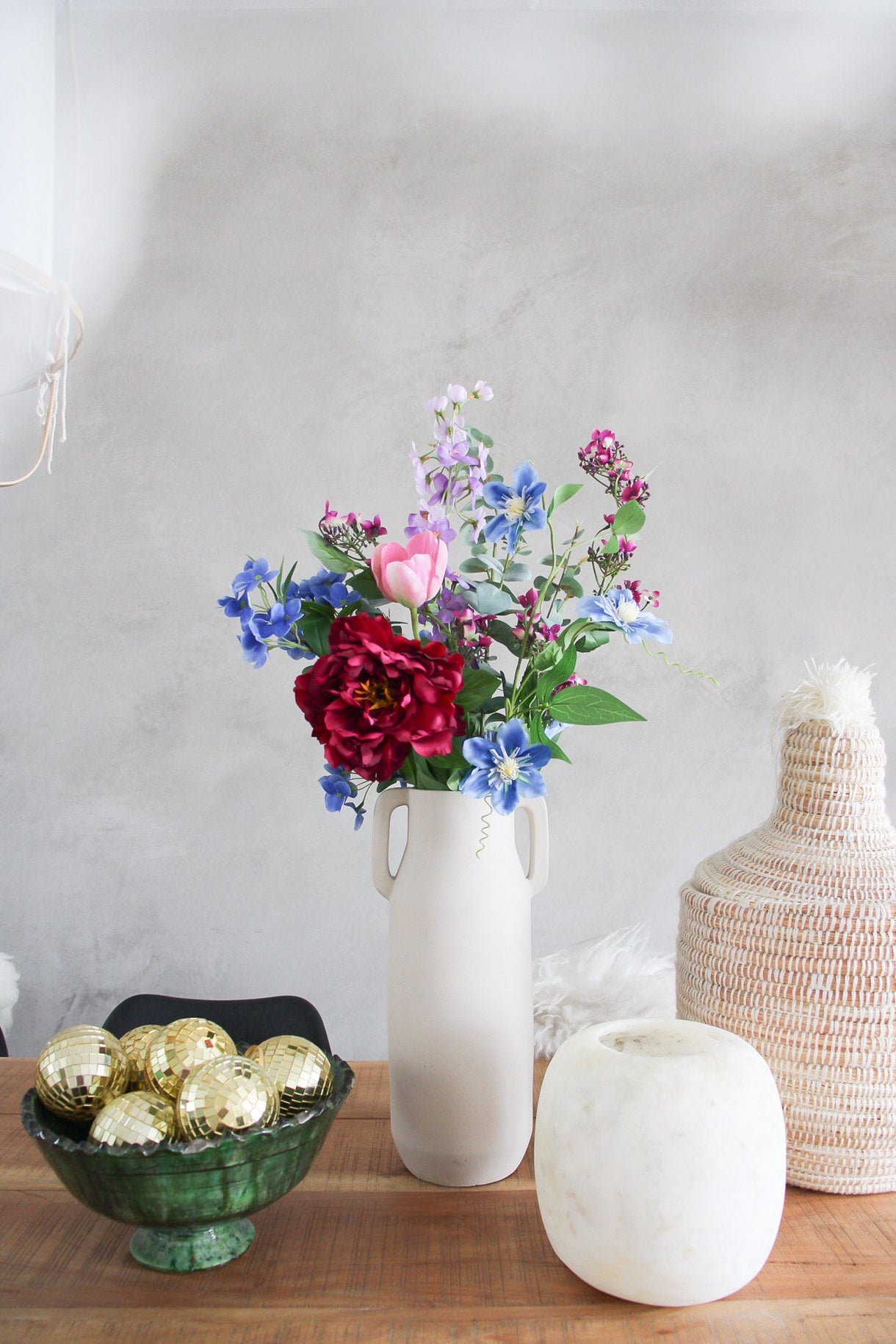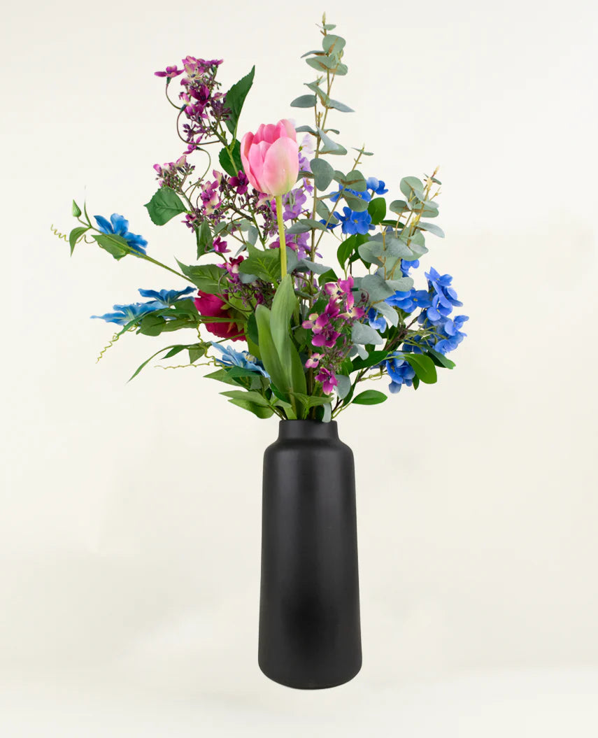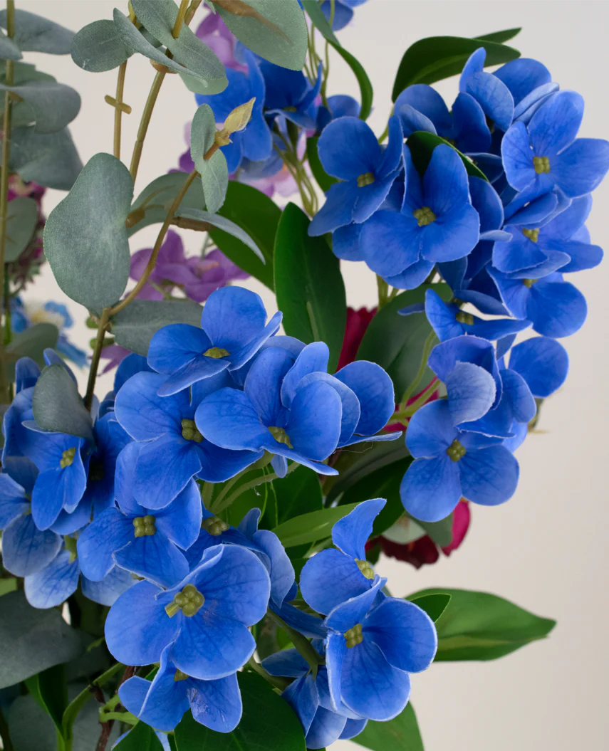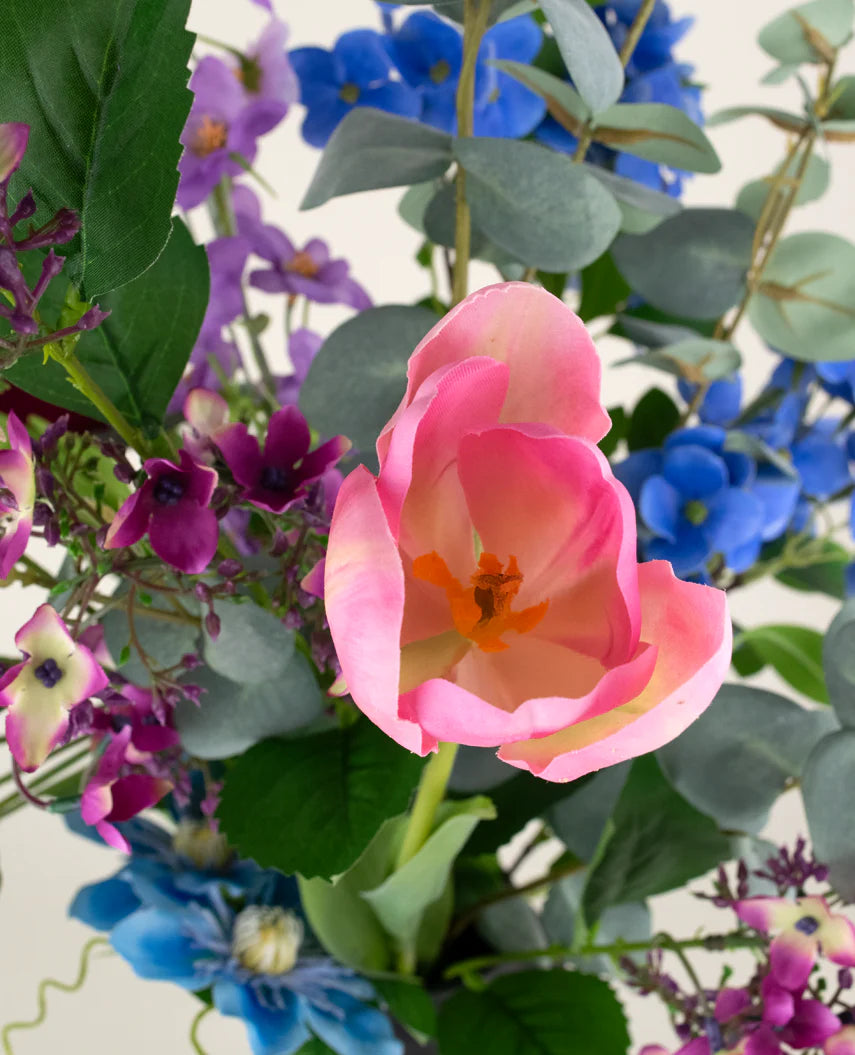 Das Blumenstrauß ist sorgfältig komponiert und enthält eine reiche Mischung aus Seidenblumen, darunter Snowball Real Touch, Clematis Double, Wild Hordera, französische Tulpe, Pfingstrose, Delphinium und Eukalyptus. Diese Kombination sorgt für ein verspieltes, aber harmonisches Ganze, in der Form, Textur und Farbe zu einem raffinierten Strauß zusammenkommen.