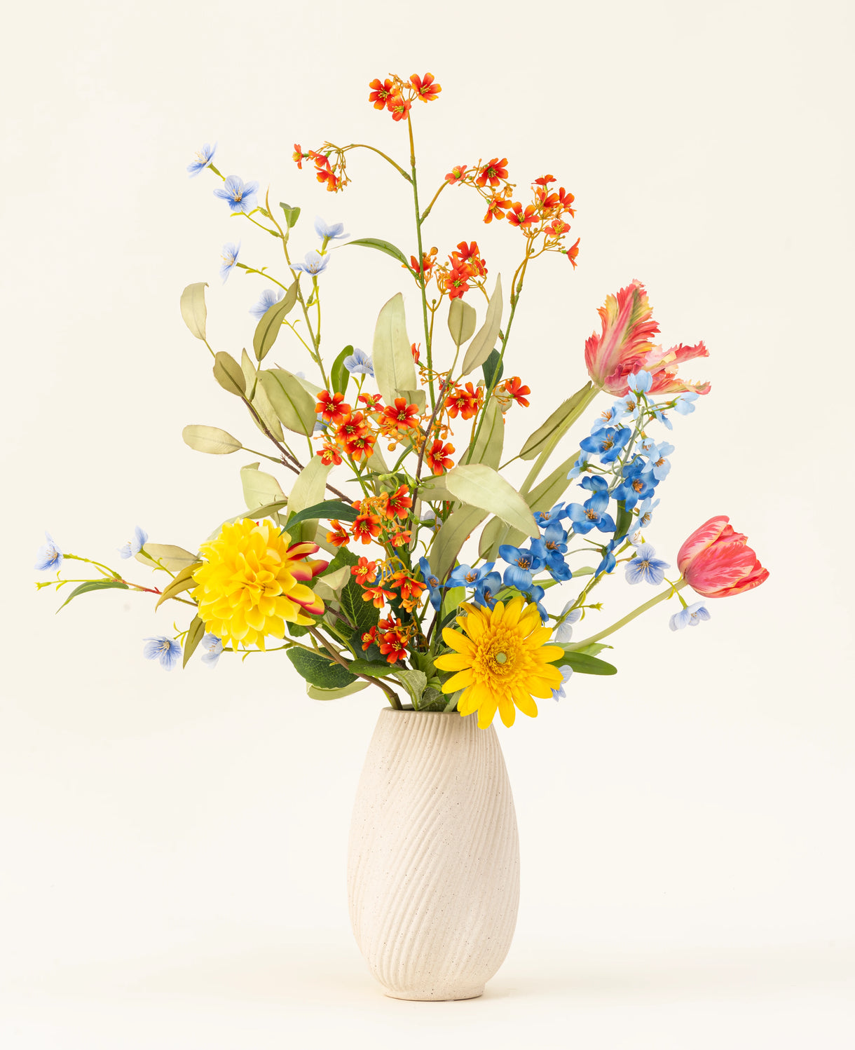 Bringen Sie eine frische und lebendige Atmosphäre in Ihr Zuhause mit Lemonade Garden, einem exklusiven Kunstblumenstrauß aus hochwertigen Seidenblumen. Mit einer Höhe von 95 cm vereint dieses luxuriöse Arrangement die farbenfrohe Schönheit und eleganten Formen von Gerbera, Delphinium, französischer Tulpe, Amaryllis und Dahlie, perfekt für ein stilvolles und zeitloses Interieur.