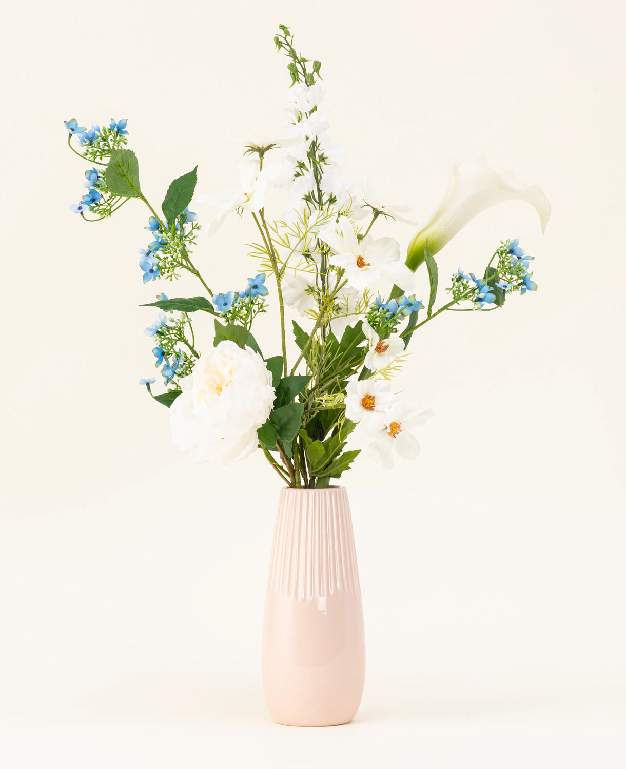Die echten Touch -Lilien fügen eine majestätische Eleganz hinzu, während die wilde blaue Hortensie einen bezaubernden Farbknopf bietet, der die gesamte Tiefe verleiht. Zusammen erzeugen diese künstlichen Blumen ein harmonisches Stück von Weichheit, Licht und Verfeinerung.