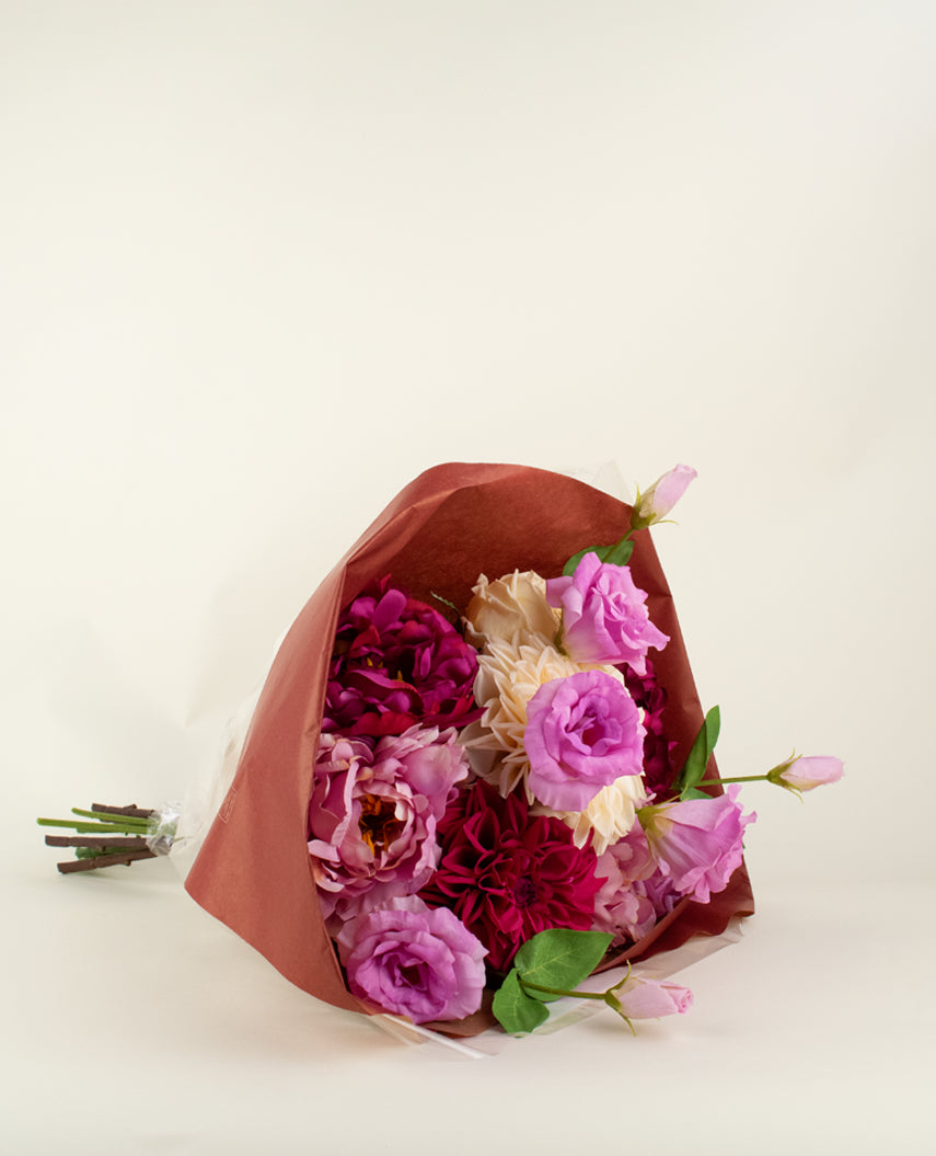 Dream Delight – eine zeitlose Mischung aus raffinierten violetten, rosa und beigen Farbtönen, die Wärme und Liebe ausstrahlen. Dieser künstliche Seidenblumenstrauß besteht aus einer Kombination von Real Touch Dahlien, Rosen und Eustoma. Der sorgfältig zusammengestellte Strauß wird in wunderschönem bordeauxrotem Blumenpapier geliefert, was ihm eine zusätzliche luxuriöse Ausstrahlung verleiht und ihn zum perfekten Geschenk für einen besonderen Anlass macht.