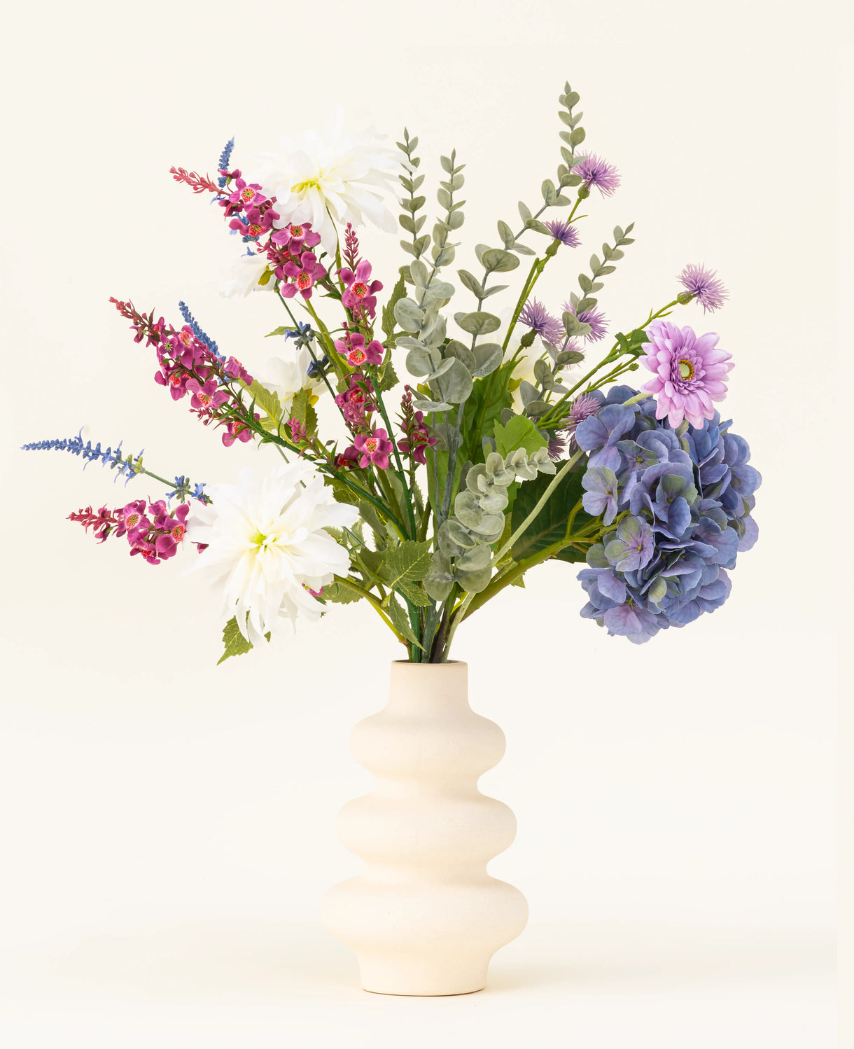 Lavender Kiss ist ein Seidenstrauß, der Romantik und Ruhe in sich vereint. Mit einer verträumten Mischung aus Flieder, Blassrosa, Blau und Weiß strahlt dieses Arrangement Zartheit und Raffinesse aus. Perfekt für alle, die dezente Farben, eine elegante Atmosphäre und einen Hauch von verspieltem Charme in ihrem Interieur lieben.