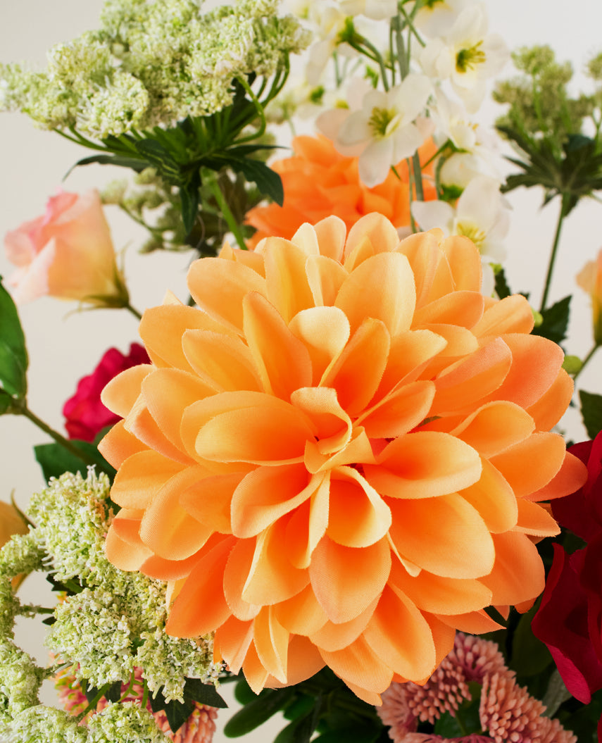 Dieser luxuriöse Kunstblumenstrauß enthält prachtvolle Dahlien, zarte Eustoma, strukturiertes Sedum, elegante Kantbloem, majestätisches Delphinium und die edle Ranunculus. Jedes Element wurde sorgfältig ausgewählt, um eine harmonische und natürliche Farbkomposition zu schaffen, die sowohl klassische als auch moderne Räume stilvoll ergänzt.