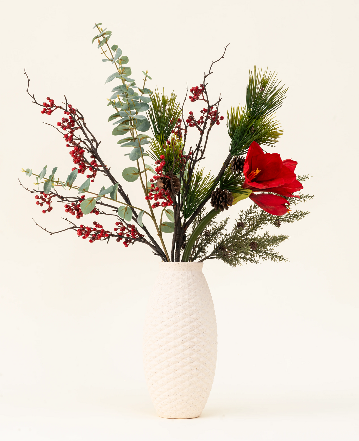 Winterberry Bliss ist ein Seidenstrauß, der die Wärme und die Atmosphäre des Winters in Ihr Haus bringt. Mit sattem Grün, leuchtenden Rottönen und eleganten Formen strahlt dieses Arrangement Gemütlichkeit und Raffinesse aus. Perfekt für alle, die nach einem festlichen Akzent suchen, der die ganze Saison über schön bleibt.